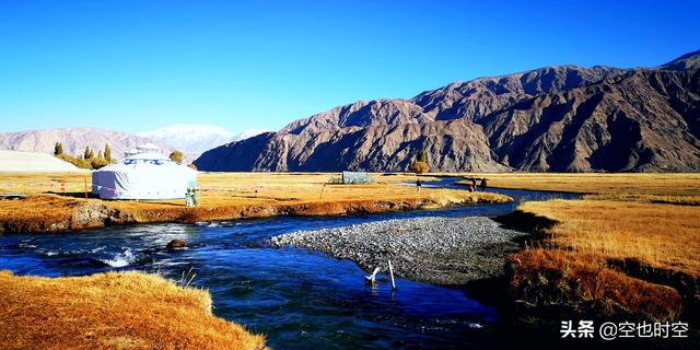 河邊,偶爾有一頂氈房映在水中,那會(huì)讓你的視角延伸,幻想更加豐富,想從這片遼闊中,捕捉到一個(gè)人,或者一群羊,為自己暖心。