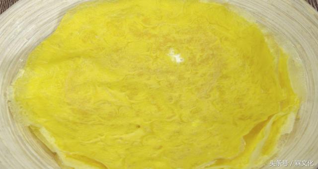 鍋中抹一層油,鍋熱后關(guān)小火,倒入蛋液,晃動鍋?zhàn)?,讓蛋液均勻鋪開,等下層蛋液凝結(jié),這蛋皮子就完成了。