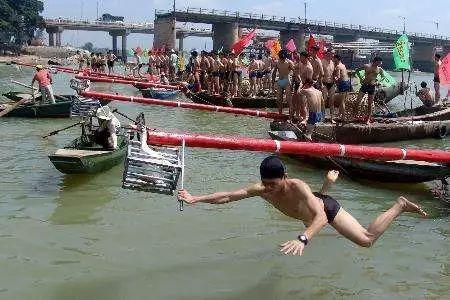 抓鴨子:泉州人端午節(jié)的慶祝項目之一。漁船的前端放置一根鐵管,鐵管末梢有一只大肥鴨,參與者要在鐵管“獨木橋”上走過抓到末梢的鴨子,獲勝者能將鴨子帶回家。