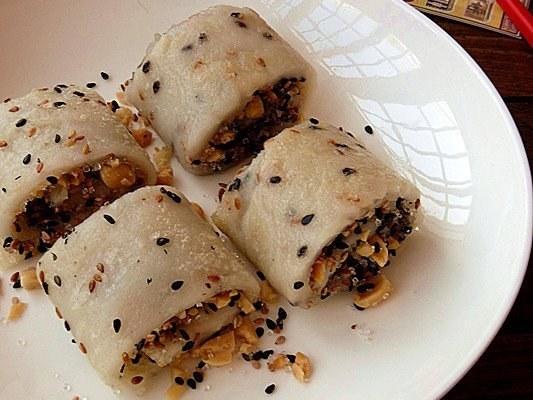 糯米炸成的面皮裹著花生碎、芝麻和白糖,切成一段段就可以上桌了;如果不喜歡吃甜的,就換成肉和蔬菜的內陷即可。