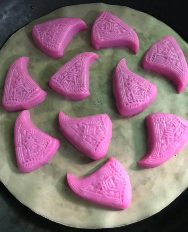 ②紅桃粿:是潮州時年八節(jié)必備的粿品。以粘米粉,紅色素,水揉合為皮,以糯米,香菇,豬肉,芹菜,綠豆混和為餡,用桃狀粿印制作而成的一種粿品。有鮮明的地方特色,象征吉祥如意的好意頭。