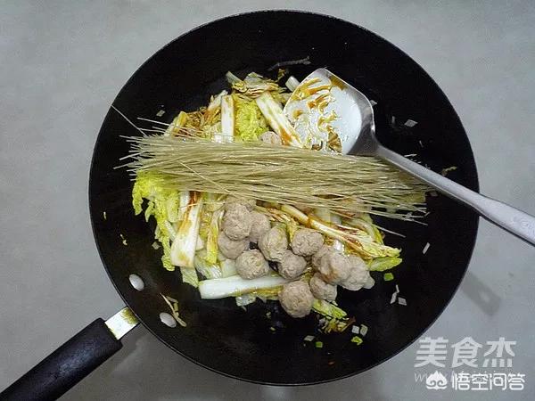 6.拌勻后加入肉丸和紅薯粉絲。(我用的紅薯粉絲比較細,沒有提前泡,如果用粗粉條需要把粉條泡軟)