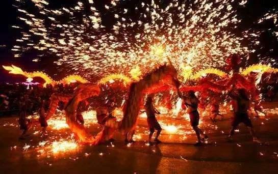 只見廣場外上空騰起炫目的火花,帶著溫度火花。人們紛紛向后退幾步,只見幾位大漢抬著熊熊燃燒的大火爐,是用風(fēng)箱加力的焦炭爐,當(dāng)中有坩堝一口,里面有沸騰的鐵水。兩位魁梧漢子,一人手握一大木板子,另一位即用大火鉗夾起坩堝,順勢傾倒在木板上,在那電光石火間,木板向上方大力揮動(dòng),只聽見呯的一響,蒼空濺射出萬千璀璨的火花,對(duì),鐵水火花!人們驚?贊嘆且自然避讓,惟恐鐵花(從上空墜下,實(shí)已變暗退溫)落在衣服上或脖領(lǐng)中。但雄壯的東方之龍卻不但不退讓,反而迎著閃爍的鐵花迅猛舞動(dòng),使其沒機(jī)會(huì)光顧龍軀和熱吻光著上身的青年。